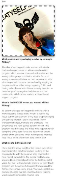 We have chosen to only help ladies over 30. Typically Mums, but not always. Helping to ditch body fat, and regain lost confidence whilst becoming energised & empowered. It's our area of expertise and we love being able to customise our support for this specific group.
